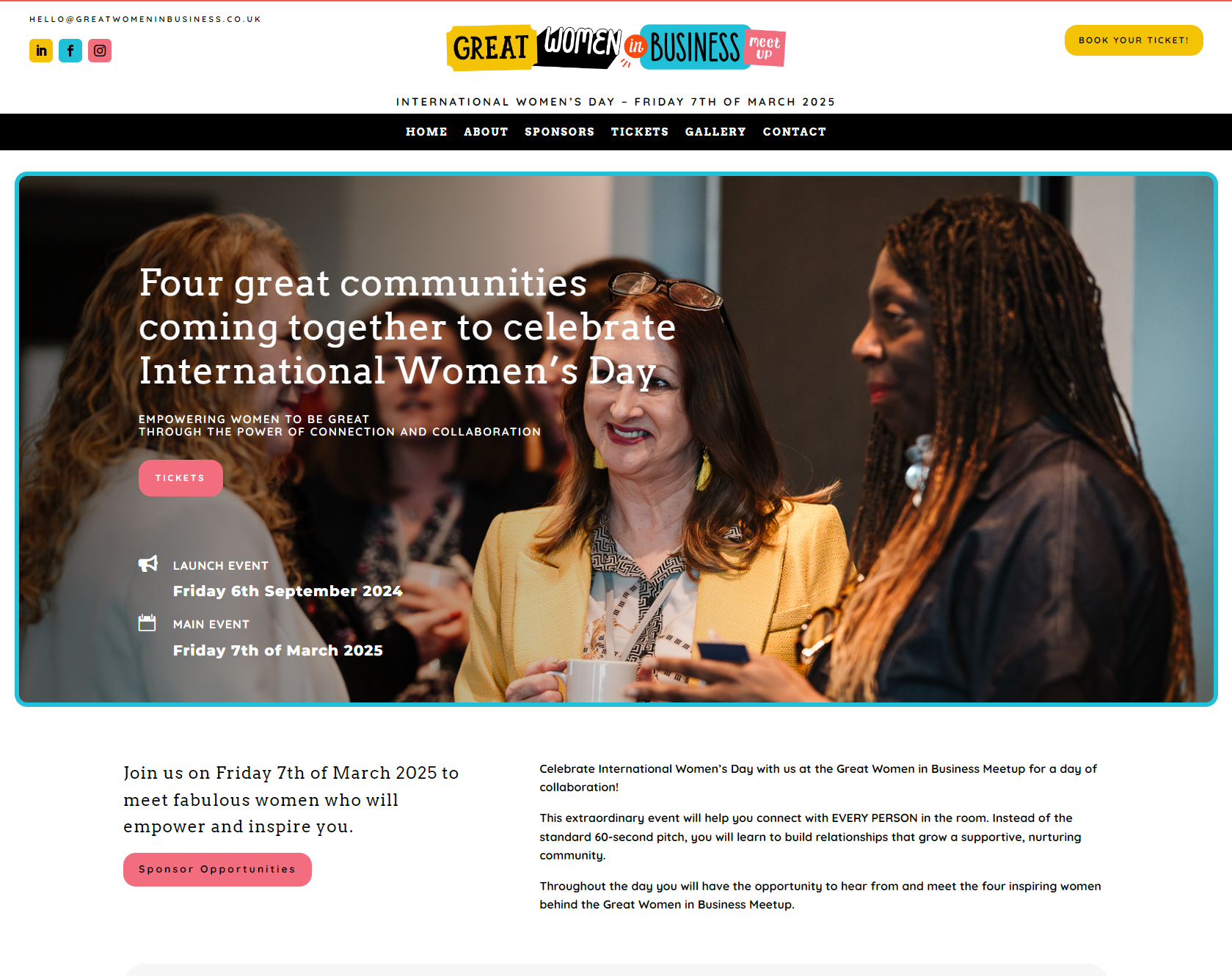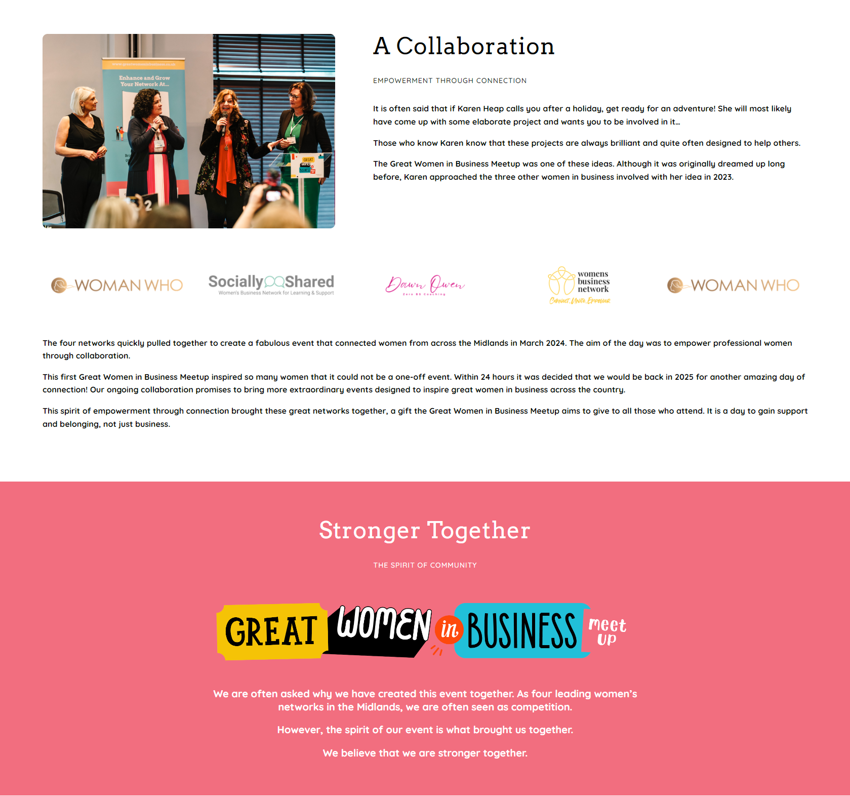 By gathering information from a variety of sources I was able to identify the tone of each individual woman from the Great Women in Business, as well as the general tone of the event itself. This was used to create inclusive and empowering copy for the Home, About page and Sponsor pages.